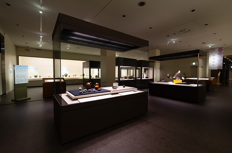 半世紀近い歴史をもつ同館は、数多くの展示ケースを所有しているが、今回、老朽化した大型展示ケースを処分し、新たにコクヨから4面ガラス大型ハイケースのフレーム付き(幅2,400mm×奥行1,800mm×高さ2,250mm)2台とフレームなし(幅2,400mm×奥行1,200mm×高さ2,250mm)6台の計8台を導入。その際、従来のケースと一緒に使用しても浮かないよう、フレームやクロスの色味を慎重に吟味した。上の写真で最新のケースを使用しているのは、左手前・茶の湯と煎茶の茶道具を取り合わせた特集展示「茶器済済」と右・動物や花など磁器製の置物の名品を紹介した特集展示「瀬戸で愛されたノベルティ」。中央奥に並ぶフレーム付き独立ケースは従来のもの。従来のケースでは約1.0mだったガラス面が1.4mと1.4倍になり、ケース自体が主張しない分、展示室全体が見渡せるようになった。