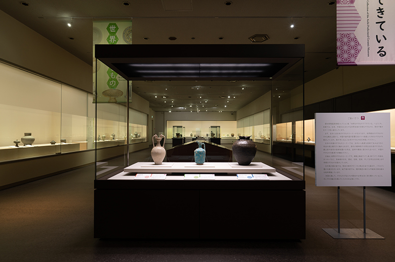 2階の常設展、愛陶コレクション展「世界はやきものでできている」では、日本、中国、世界各地のやきものが人々の生活に深く関わってきた様子を紹介。展示室入口に新規導入した4面ガラス大型ハイケースのフレームなしタイプを設置し、その企画趣旨を象徴する3点の作品を展示した。