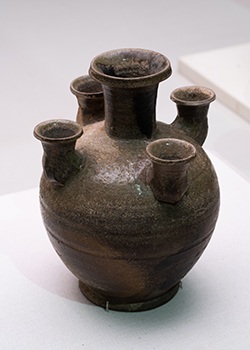 重要文化財「灰釉多口瓶」(猿投窯、平安時初期)。5つの口をもつ特徴的な形で使用方法は不明だが、仏教関連の特別な道具と考えられている。