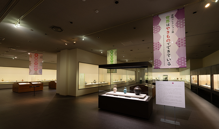 本館2階の愛陶コレクション展「世界はやきものでできている」では、日本、中国、世界各地のやきものが人々の生活に深く関わってきた様子を紹介している。懸垂幕のデザインは田畑さんが手がけた。