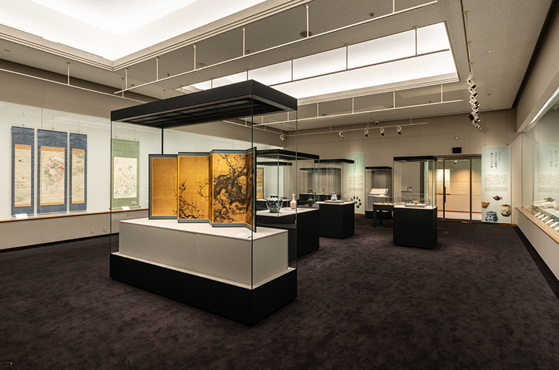 掛け軸は住友家の邸宅に飾られていた往時を想起できるよう、床の間をイメージした展示をしたいとのリクエストに応え、企画展示室のハイケースには着脱式パネルを付けた(写真はパネルをつけずに屏風を展示した状態)。背面と両サイドにパネルを立てると、コの字に囲まれた床の間風の展示空間が演出できる。上部照明も着脱パネルの有無で配光を変えられるよう工夫した。